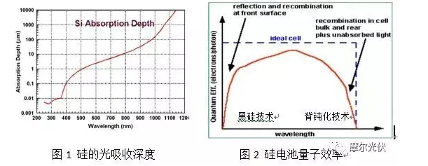 方面1:光在硅中的吸收深度如圖1所示,短波主要在硅電池上表面1μm深度內吸收,長波則能穿透更深的距離。黑硅及背鈍化技術可以提升硅電池的短波及長波吸收,提升量子效率。