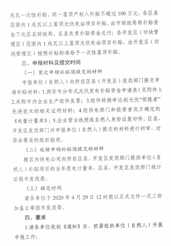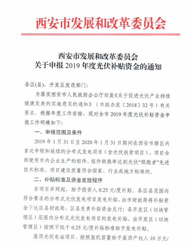 2019年1月31日至2020年1月31日期間在西安市轄區(qū)內(nèi)首次申領(lǐng)和延續(xù)的分布式發(fā)電項(xiàng)目(含光伏扶貧項(xiàng)目),項(xiàng)目全部使用市內(nèi)企業(yè)生產(chǎn)的組件,組件轉(zhuǎn)換率達(dá)到光伏“領(lǐng)跑者”先進(jìn)技術(shù)標(biāo)準(zhǔn),項(xiàng)目建設(shè)質(zhì)量符合國家、行業(yè)或地方標(biāo)準(zhǔn)的。