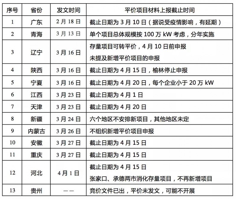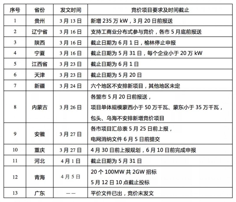 國家能源局要求在6月15日之前完成競價上網(wǎng)項目的申報。由于省內(nèi)要提前開展項目審核工作,所以一般要求企業(yè)在5月底將項目相關(guān)材料(備案文件、土地文件、接網(wǎng)意見函)上報;有的省份直接要求提供電網(wǎng)批復(fù);有的省份,還要提前開展省內(nèi)競價(如青海)。這些都需要提前開展工作。