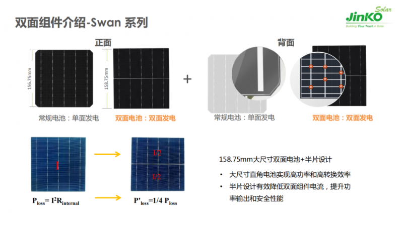 在4月2日舉行的2020首場雙面技術(shù)與應(yīng)用在線研討會(huì)上,晶科能源產(chǎn)品經(jīng)理劉曉穎表示,Swan雙面透明背板組件具有輕量化、高效率等優(yōu)勢(shì)。由于采用了158.75mm大尺寸雙面電池和半片技術(shù),在提升組件轉(zhuǎn)換效率的同時(shí),可以降低組件內(nèi)部電流,使組件的輸出功率和安全性大幅提升。