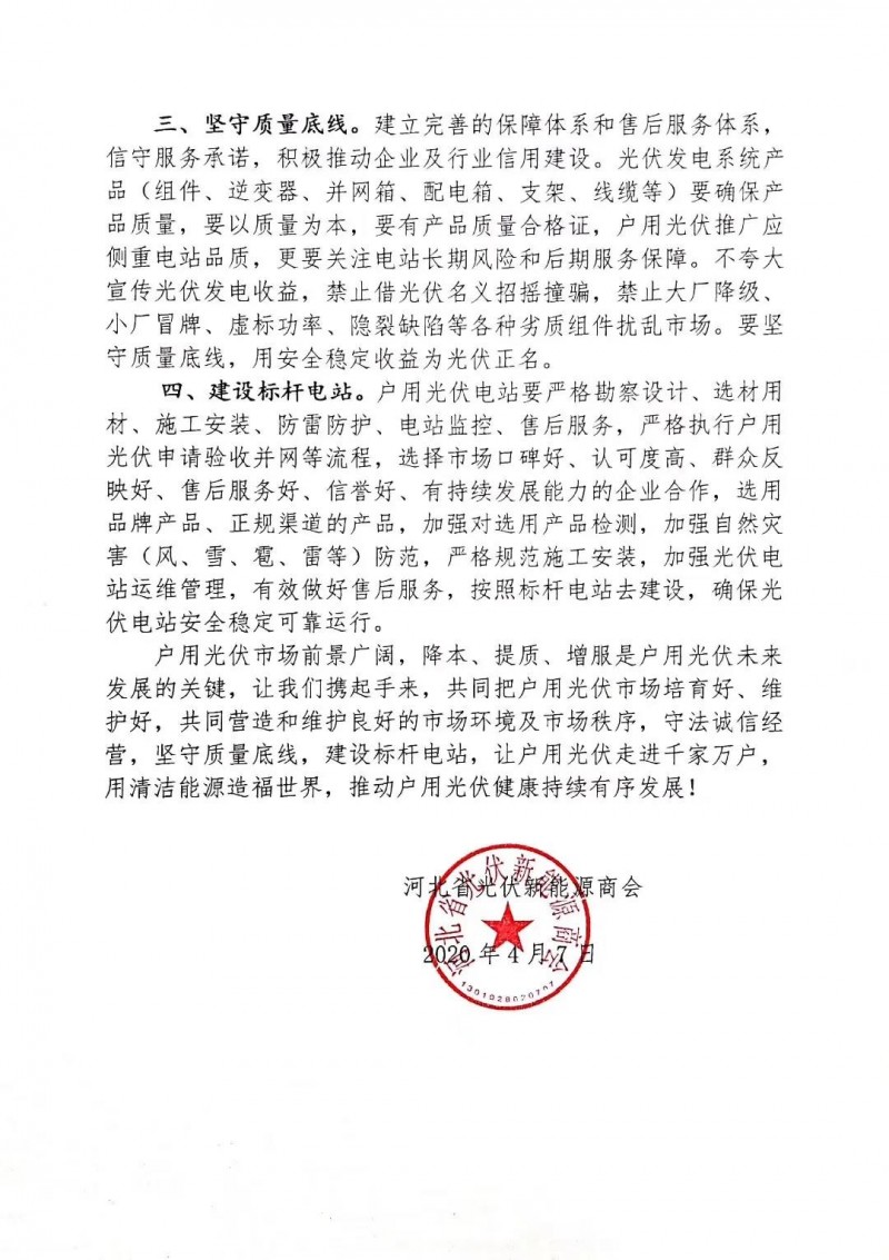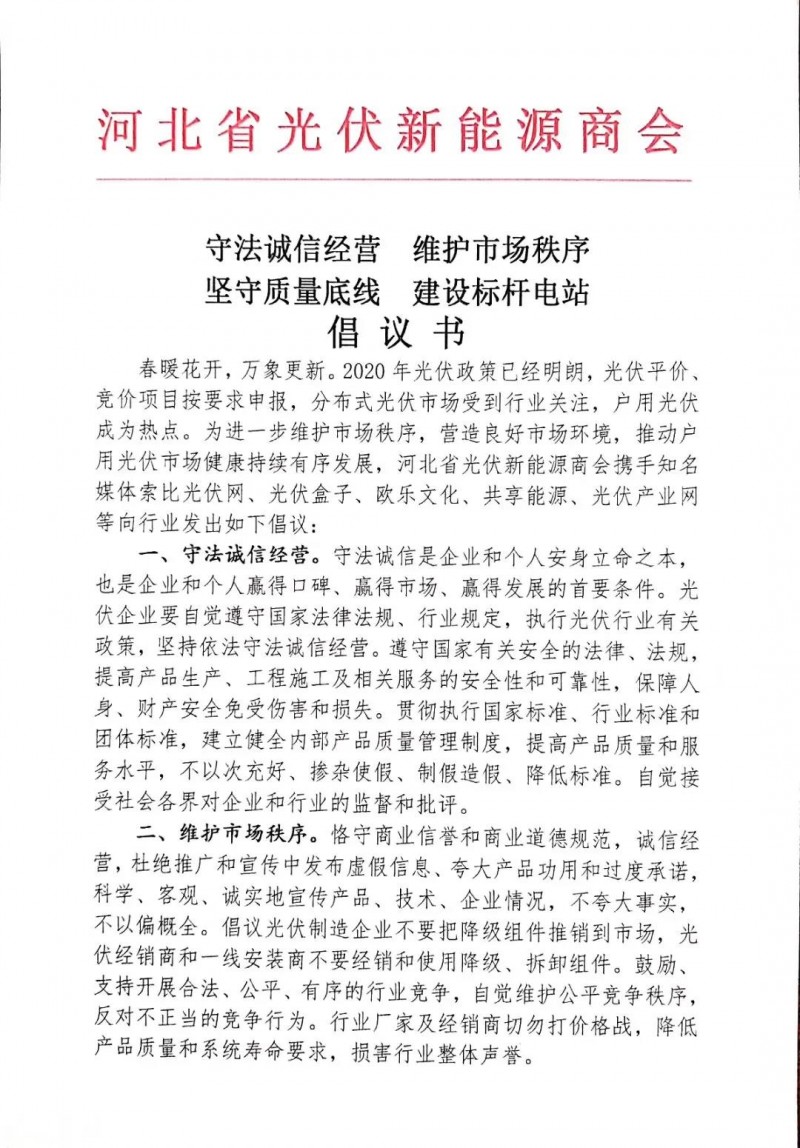 春暖花開,萬象更新。2020年光伏政策已經明朗,光伏平價、競價項目按要求申報,分布式光伏市場受到行業關注,戶用光伏成為熱點。為進一步維護市場秩序,營造良好市場環境,推動戶用光伏市場健康持續有序發展,河北省光伏新能源商會攜手知名媒體索比光伏網、光伏盒子、歐樂文化、共享能源、光伏產業網等向行業發出如下倡議: