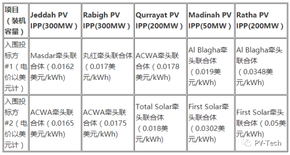 REPDO還說明了第二輪招標中其他項目的電價。從ACWA到First Solar、丸紅等公司,入圍投標方(見下表)為20MW-300MW光伏項目報出了多種價格。