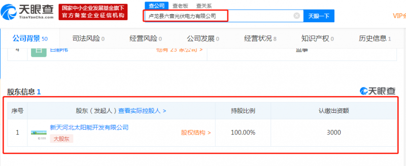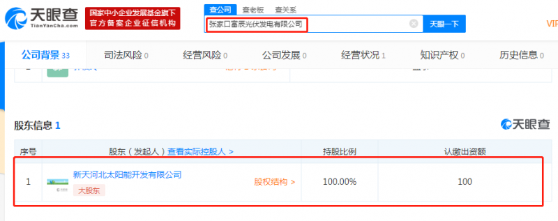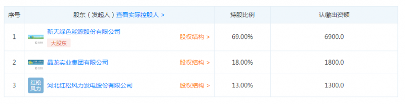 從天眼查獲悉,2014年4月24日,新天綠能聯(lián)合晶龍實(shí)業(yè)集團(tuán)有限公司、河北紅松風(fēng)力發(fā)電股份有限公司兩家企業(yè)共同設(shè)立新天河北太陽能開發(fā)有限公司,該公司主營業(yè)務(wù)為對太陽能等新能源項(xiàng)目的投資和太陽能設(shè)備銷售。其中,新天綠能持股比例69%,為第一大股東;晶龍實(shí)業(yè)集團(tuán)持股比例18%,為第二大股東;河北紅松風(fēng)力發(fā)電股份有限公司持股比例13%,為第三大股東。