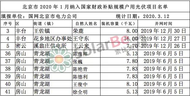 從索比光伏網了解的情況看,多數省份都按照這一原則對戶用項目信息進行了統計和公示。不過,國網北京市電力公司發布的《2020年1月北京市納入2020年國家財政補貼規模戶用光伏項目名單》中,將9個2019年下半年并網的戶用光伏項目納入了2020年補貼范圍。