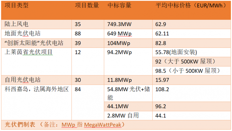 在法屬海外地區和科西嘉島的招標中,劃分了84個光伏項目,總裝機容量達101.7MW。其中包括38個“太陽能+儲能”新項目,共計54.8MW,均價為108.20歐元/MWh;37個純光伏新項目,總裝機容量44.1MW,平均價為96.20歐元/MWh;另一個9個自用項目的平均股權溢價為44.10歐元/MWh。