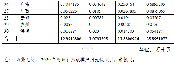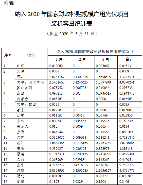 附表:納入2020年國家財政補貼規模戶用光伏項目裝機容量統計表(截至2020年3月31日)