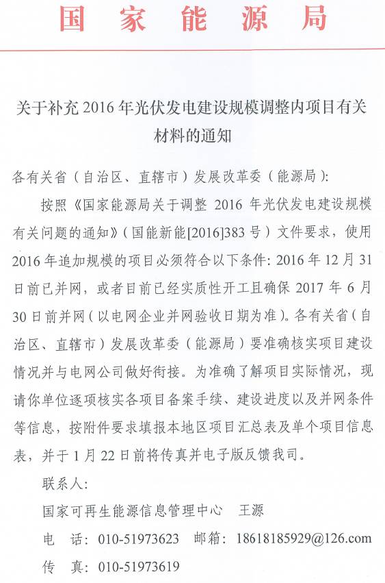 2016年12月22日,國家能源局緊急發(fā)布 國能新能〔2016〕383號 《國家能源局關于調(diào)整2016年光伏發(fā)電建設規(guī)模有關問題的通知》,要求各省于31日前將各省的項目名單上報,各省慌亂中估計很多項目都不符合規(guī)范,能源局再次發(fā)文要求各省認真落實。