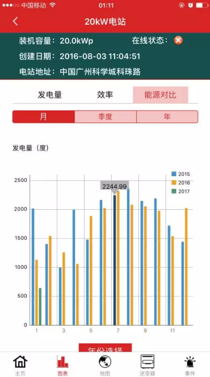 可以選擇歷史數據中的月、季度、年數據進行對比分析,客觀反映電站所在地區光照強度變化及電站衰減情況。