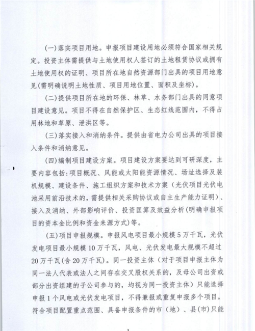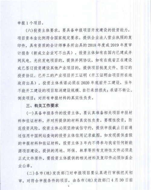 通知要求,風電項目最低申報規模不得低于50MW,光伏不得低于100MW,最大規模不得超過200MW。同一投資主體只能申報1個風電場或光伏項目,投資主體須在2020年底前開工,支持存量項目轉平價,報送截止日期為4月30日。