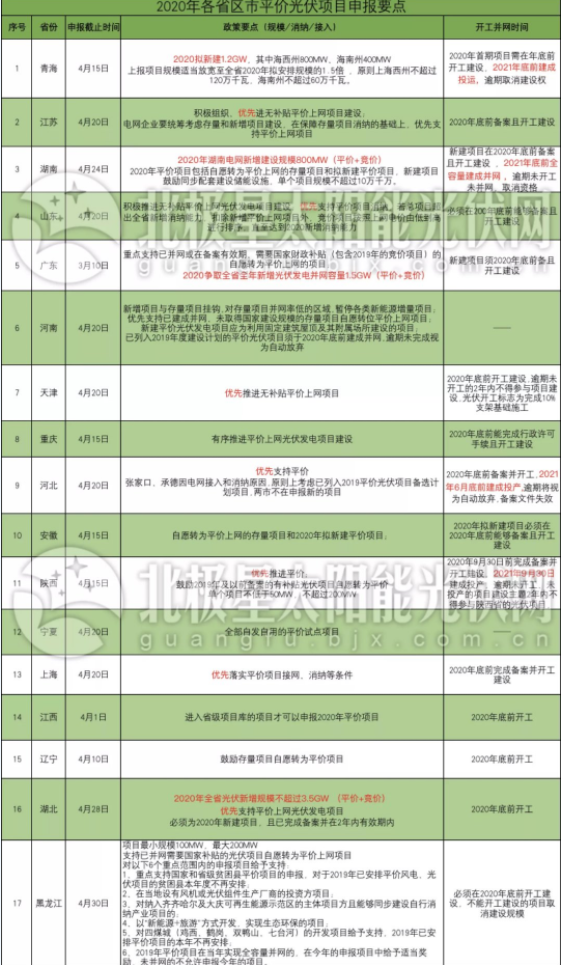 時間進入4月下旬,截至目前,青海、江蘇、湖南、山東等17個省區市已相繼下發平價項目申報政策,最晚申報日前為4月30日(黑龍江)。剩余一周時間,2020年光伏平價項目申報即將收官。