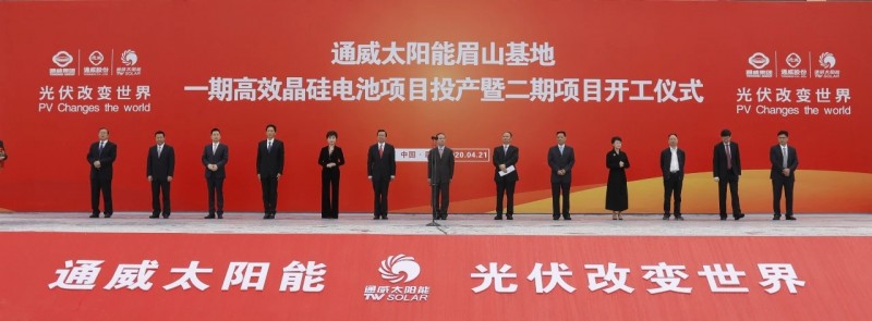 2020年4月21日,通威眉山一期高效太陽能電池項目正式建成投產,四川省人民政府副省長李云澤,省經濟和信息化廳二級巡視員肖世同,甘孜州委書記劉成鳴,州委副書記、州政府州長肖友才,州政府副州長杜德清,眉山市委書記慕新海,市委副書記、市政府代理市長胡元坤,市委副書記、天府新區眉山黨工委書記黃劍東,市委常委、市委秘書長汪樹槐,市政府副市長冉登祥等領導出席。十一屆全國政協常委、全國人大代表、通威集團董事局主席劉漢元,通威集團董事長管亞梅,通威集團總裁禚玉嬌,通威集團黨委書記、通威股份董事長謝毅,通威股份副董事長嚴虎,通威集團副總裁管亞偉等出席儀式。