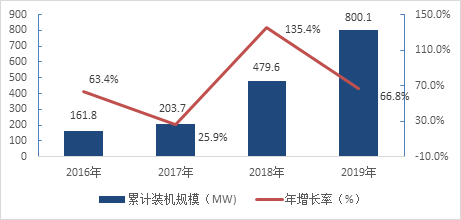 圖1:中國已投運光儲項目的累計裝機規模(2016-2019年)