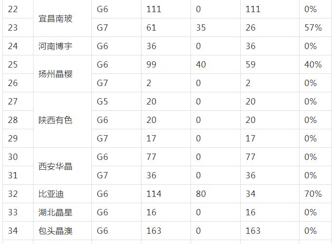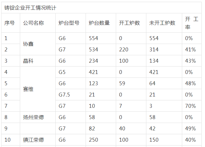 受單晶硅片價格大跌倒逼,在現金成本紅線徘徊的多晶硅片價格也跟著下跌,目前多晶硅片市場價格在1元/片左右,已經跌破多晶硅片的現金成本,目前多晶硅片的現金成本在1.2元/片左右(非硅成本0.6元/片,硅料成本0.6元/片),這也意味著目前還在生產的多晶硅片企業正在虧著現金,因此不少多晶硅片企業不得不暫時停產或減少開工鑄錠爐臺數,那么目前市場哪些鑄錠企業停產了呢?哪些鑄錠企業還在生產?還在生產的鑄錠企業開爐情況如何?光伏新聞特意做了一個調查,光伏新聞不完全統計的結果為:目前全行業鑄錠爐臺數量為5266臺,開工爐臺數量為1454臺,鑄錠爐平均開工率為28%。具體各鑄錠企業開工情況如下表所示: