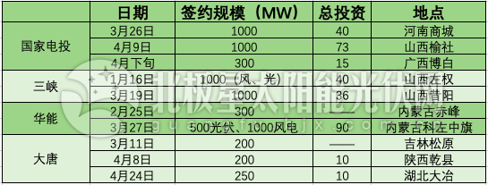 2020年開年,以國家電投、三峽、華能、大唐為首的電力央企紛紛與地方政府簽訂開發協議,提前鎖定風、光等項目開發權。截至目前,國家電投已簽約2.3GW光伏項目、三峽2GW(含風電)、華能1.8GW(含1GW風電)、大唐650MW,總投資超314億元。
