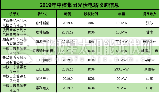 2019年,中核集團旗下公司還通過電站交易,分別從珈偉新能、清源股份、順風清潔能源、江山控股、晶科電力5家企業分別接手了230MW、77.1MW、490MW、280.5MW、70MW光伏電站,總容量1.13GW。