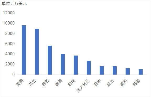 分國別出口情況來看,一季度作為全球光伏市場的傳統淡季,今年也延續了往年整體海外光伏市場情況,光伏企業出口集中在歐美、日本、印度和部分區域市場。一季度逆變器出口到9個國家,金額超過1000萬美元,前20個國家出口金額占比達86%。