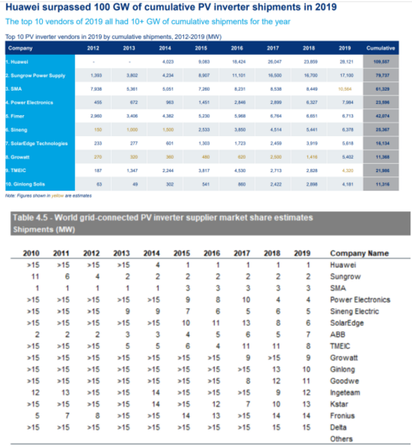 近日,多家機構相繼發布2019年逆變器出貨量排名報告。其中,Wood Mackenzie發布的Global solar PV and MLPE inverter market 2020報告顯示,2019年全球光伏逆變器出貨量前2位均是中國企業,其中排名第一的華為2019年出貨量約28.121GW,累計出貨量109.557GW,穩居全球首位;IHS Markit報告也指出,2019年全球逆變器出貨TOP10企業中,有5家是中國企業,華為更是連續5年蟬聯冠軍,王者地位不可撼動。