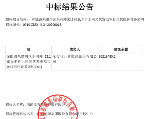 東方日升中標(biāo) 深能酒泉肅州區(qū)52.1MW平價(jià)項(xiàng)目光伏組件采購(gòu)中標(biāo)結(jié)果公示