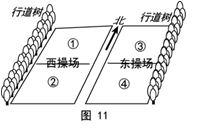 高考真題(2012年安徽卷) 圖11為我省平原地區某中學的操場和行道樹示意圖(晴天8:00前后,東操場大部分被行道樹的樹蔭覆蓋)。完成30-31題。
