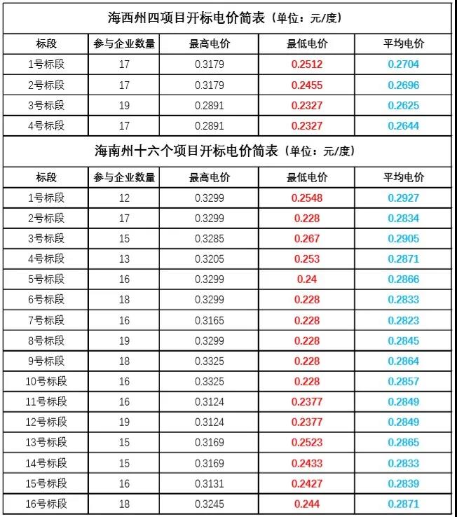 縱觀海西州、海南州二十個競價項目的報價可以發(fā)現(xiàn),海西州四個標段的平均報價在0.2625-0.2704元/度,其中單個標段的最低價格為0.2327元/度。海南州16個標段的平價報價在0.2823~0.2927元/度,最低投標電價為0.228元/度。而青海以0.2277元/度的水電交易價格作為基準價計算補貼,也就是說0.228元/度的投標電價幾乎等于基準電價,兩者之間僅有0.0003元/度的差距。