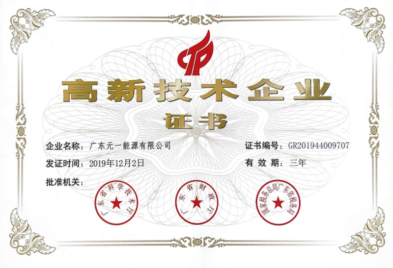 高新技術企業是科技創新的重要載體,是發展高新技術產業和戰略性新興產業的骨干力量。成功獲得高新技術企業認定,充分說明了國家相關部門對元一能源工作成果的肯定,同時也代表著元一能源在技術創新、知識產權、研發能力及企業成長性等方面得到官方認可,是公司發展的一個重要里程碑。