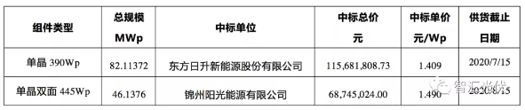 中標(biāo)價格:總價,134017228.8元;折合單價,1.598元/Wp;