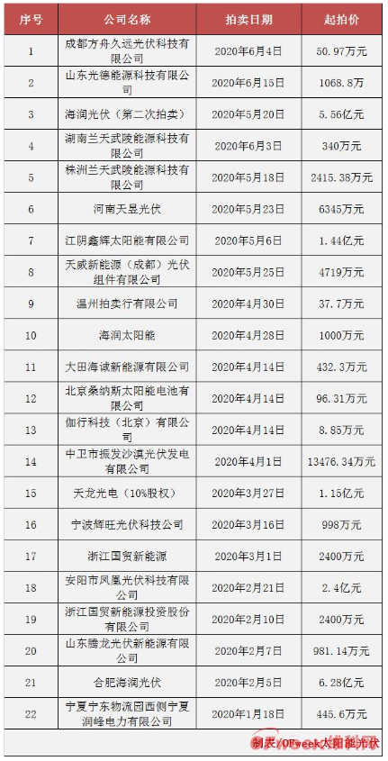 事實(shí)上,2020年開(kāi)年至今,類似上述拍賣的消息從未間斷,據(jù)OFweek太陽(yáng)能光伏不完全統(tǒng)計(jì),截至上半年,累計(jì)拍賣的企業(yè)超出20家之多。