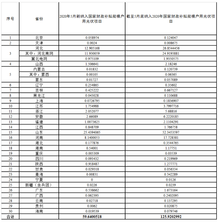 根據各省級能源主管部門、電網企業報送信息,經國家可再生能源信息管理中心梳理統計,2020年5月新納入國家財政補貼規模戶用光伏項目總裝機容量為59.64萬千瓦。截至2020年5月底,全國累計納入2020年國家財政補貼規模戶用光伏項目裝機容量為125.92萬千瓦。詳細情況見附表。