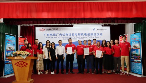 TUV萊茵大中華區太陽能與商業產品服務質量管理者代表及簽證官尹伏桂、廣東電纜廠總經理游均華等雙方代表出席了頒證儀式。廣東電纜廠區域銷售總監陳兆杭在致辭中對TUV萊茵人員的到來表示歡迎,隨后尹伏桂代表TUV萊茵致辭并為廣東電纜廠頒發TUV萊茵型式認證證書,廣東電纜廠區域銷售總監陳兆杭、副總工程師高偉紅、外貿總經理劉凱發代表企業接收了證書。