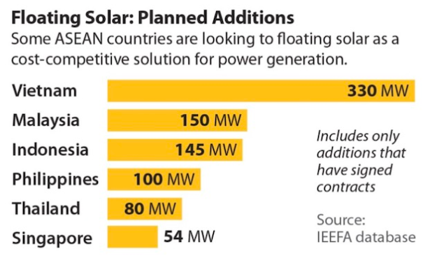 目前,一些東盟國家正在把浮動式太陽能作為一種發電成本競爭的解決方案,至少五個國家宣布了大規模的浮動太陽能計劃(如下圖)。