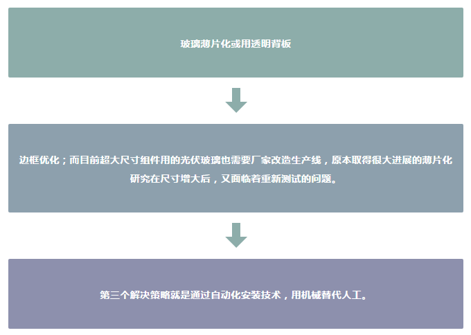 大組件可以節約土地,減少人工,但過大的組件尺寸也會對下游安裝帶來影響,尤其是雙面發電組件日漸成為主流,進一步加大組件重量。