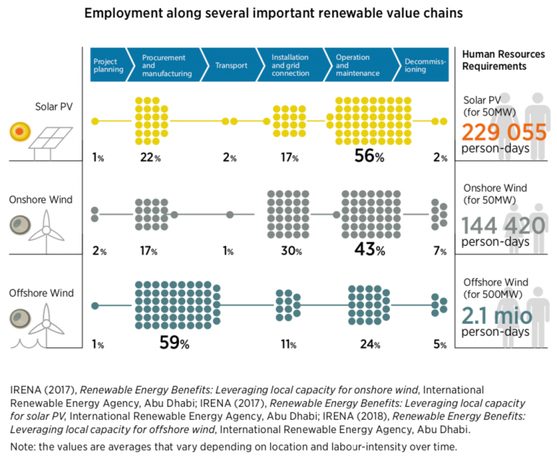 500兆瓦的海上風電總共需要投入210萬工日,其中1%用于項目的前期規劃, 59%采購、制造、運輸, 11%用于系統安裝和并網,24%用于系統的運營和維護, 5%用于系統退役拆除。