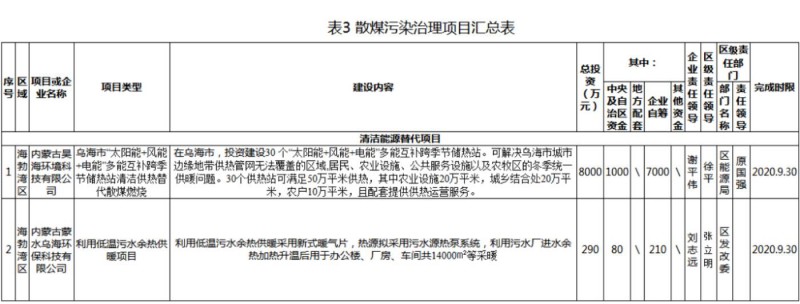《方案》要求,9月30日前重點落實兩個散煤污染治理項目,其中烏海市“太陽能+風能+電能”多能互補跨季節儲熱站清潔供熱替代散煤燃燒項目計劃總投資8000萬元,包含中央及自治區資金1000萬元,企業自籌資金7000萬元。