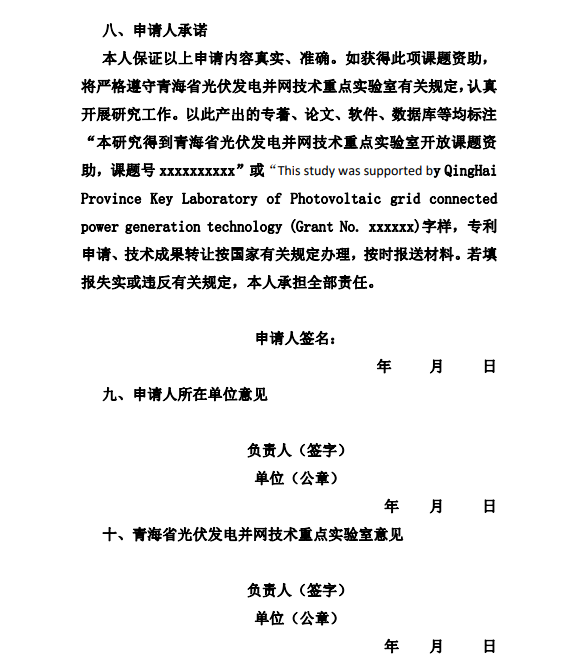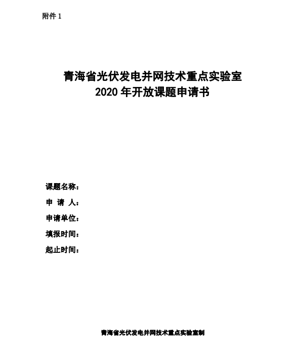 開放課題研究期限一般為一年,申請書一式 10 份,用 A4 紙雙 面打印,加蓋所在單位公章后送至或郵寄至青海省光伏發(fā)電并網(wǎng)技術(shù) 重點實驗室,青海省西寧市五四西路 80 號,并提交電子版,以姓名 為主題發(fā)送至聯(lián)系人郵箱。