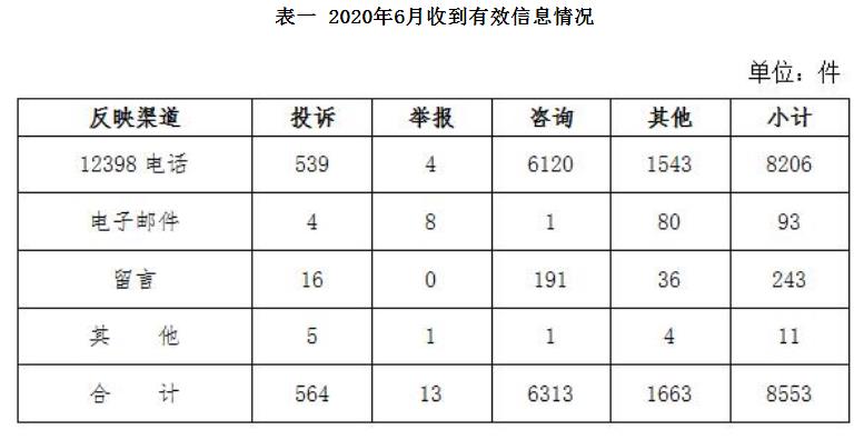 按反映渠道分類,12398電話8206件,電子郵件93件,留言243件,其他11件。(2020年6月收到有效信息情況見表一)