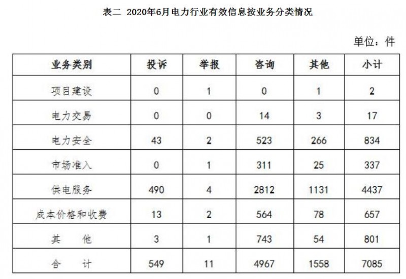 電力行業(yè)排在首位,有效信息數(shù)量為7085件,占全部有效信息的82.84%;其中受理的投訴舉報數(shù)量431件,占全部投訴舉報數(shù)量的74.70%。群眾反映問題主要集中在供電服務(wù)、電力安全、成本價格和收費(fèi)等方面。(2020年6月電力行業(yè)有效信息按業(yè)務(wù)分類情況見表二)