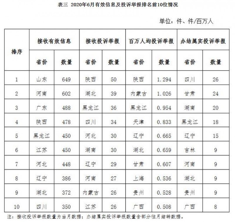 各省(自治區(qū)、直轄市)按照收到的有效信息數(shù)量排序,山東、河南、廣東、陜西、黑龍江、江蘇、河北、遼寧、湖北、四川等列全國前10位;按照投訴舉報數(shù)量排序,陜西、湖北、黑龍江、四川、河北、湖南、遼寧、河南、內(nèi)蒙古、江蘇等排在全國前10位;按照百萬人均投訴舉報數(shù)量排序,陜西、內(nèi)蒙古、黑龍江、天津、遼寧、湖北、甘肅、上海、貴州、廣西等排在全國前10位;按照辦結(jié)屬實投訴舉報數(shù)量排序,四川、甘肅、湖南、黑龍江、遼寧、吉林、河南、湖北、貴州、廣西等排在全國前10位。(2020年6月有效信息及投訴舉報排名前10位情況見表三)