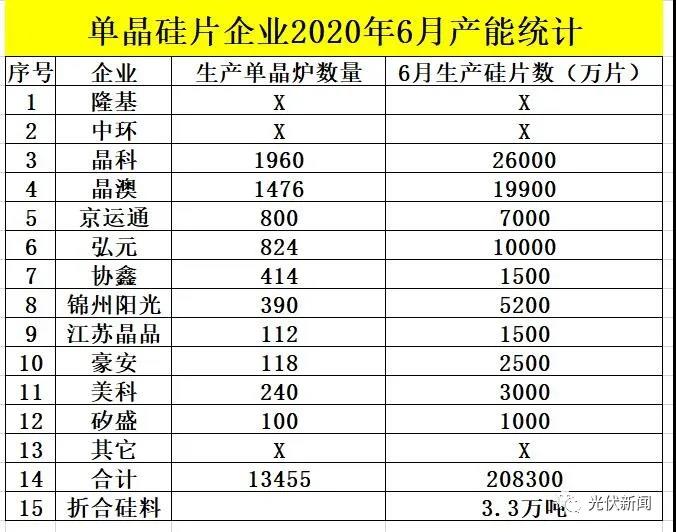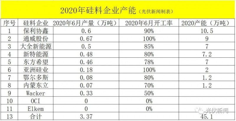 之前單晶致密料價格跌破60到58元/公斤,最低時鑄造多晶硅價格也到了26-27元/公斤,這個價格比一些多晶硅企業的現金成本還低,因此大部分多晶硅企業紛紛停產減產。小編對多晶硅企業2020年6月的產能與硅片企業6月的產能做了一個調研。2020年6月,全球多晶硅企業的實際產量在3.37萬噸左右,其中2.9萬噸單晶用料,0.47萬噸鑄錠用料。調研中還發現,國內多晶硅企業只有通威、亞洲硅業在滿產,即便協鑫、大全、特變、東方希望都沒有滿產,而國外多晶硅企業僅僅只有瓦克開了50%左右的產能,其余多晶硅巨頭如韓國OCI、馬來西亞OCI、挪威Elkem等都已經停產。因此,即便國內兩家多晶硅巨頭發生事故不能滿產,只要其余多晶硅廠家滿產,就可以馬上滿足硅片企業對多晶硅的需求。