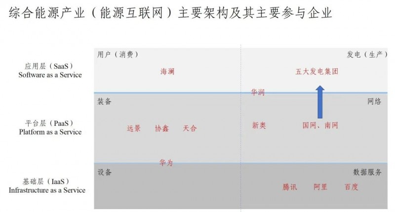 目前,一個折中的方案是將系統平臺進行社會分工,我分成三個層次,應用層(SaaS,Software as a Service)、平臺層(PaaS,Platform as aService)和基礎設施層(IaaS,Infrastructure as a Service),目前參與綜合能源產業(能源互聯網)的主要企業均可以在這種分工中找到相應的位置所示(如下圖)。