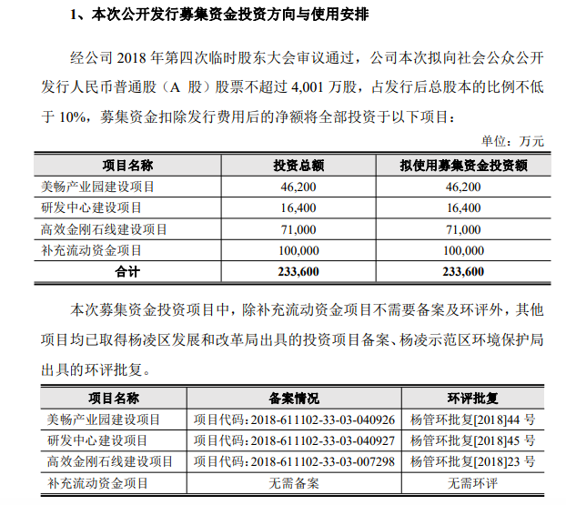 據(jù)招股書顯示,美暢股份擬公開發(fā)行A股不超過4001萬股,擬募資金額23.36億元,主要投資于美暢產(chǎn)業(yè)園建設(shè)項(xiàng)目、研發(fā)中心建設(shè)項(xiàng)目、高效金剛石線建設(shè)項(xiàng)目以及補(bǔ)充流動(dòng)資金項(xiàng)目。本次募投的高效金剛線建設(shè)項(xiàng)目,計(jì)劃總投資7.1億元,預(yù)計(jì)建設(shè)期為24個(gè)月,將通過租賃生產(chǎn)車間及倉庫,購置先進(jìn)的自動(dòng)化生產(chǎn)線、檢驗(yàn)設(shè)備及環(huán)保設(shè)施等,新增高效金剛石線年生產(chǎn)能力 1,500 萬公里。