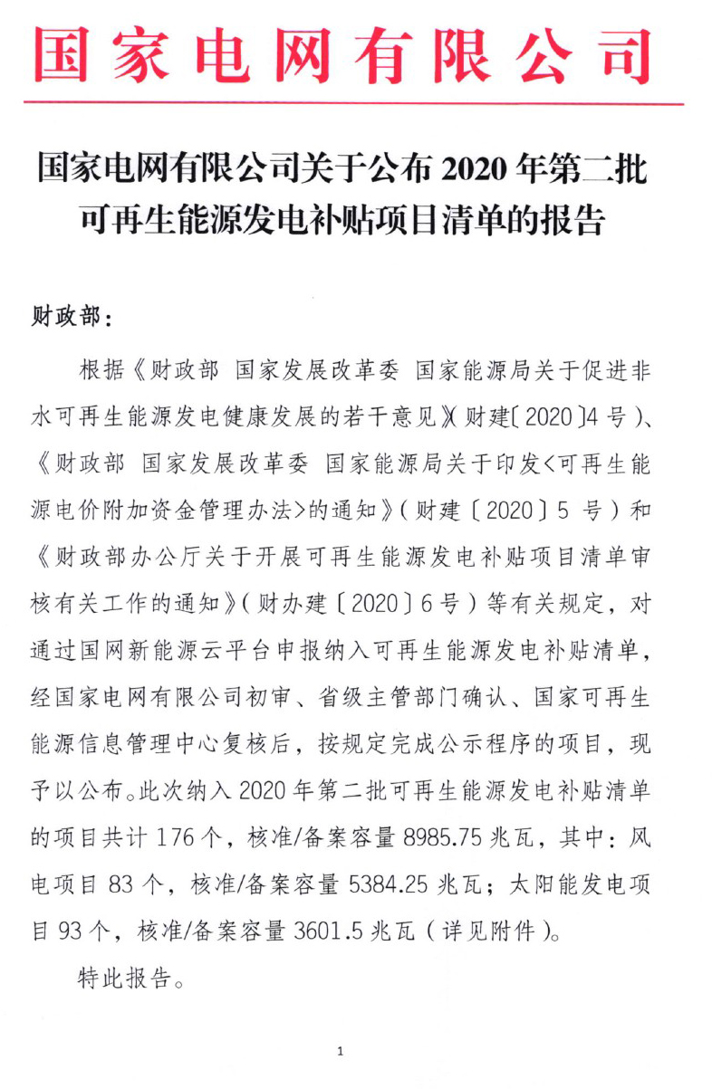 關于公布2020年第二批可再生能源發電補貼項目清單的公告