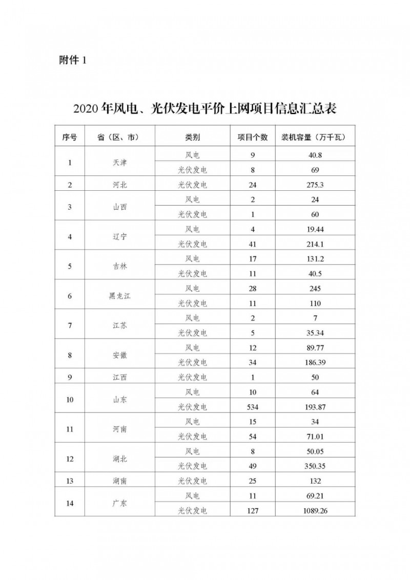 附件:1.2020年風電、光伏發電平價上網項目信息匯總表