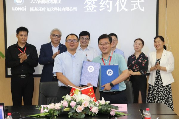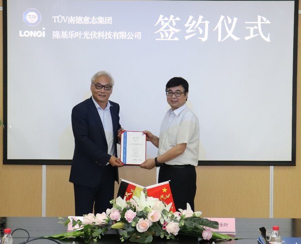 西安2020年8月10日 /美通社/ -- 8月6號,全球領先的第三方檢測認證機構TUV南德意志集團(以下簡稱“TUV南德”)為隆基樂葉光伏科技有限公司(以下簡稱“隆基樂葉”)頒發了ISO 9001、ISO 14001、ISO 45001質量、環境、職業健康安全管理體系認證證書,并簽署了戰略合作協議。TUV南德北亞區管理服務部高級副總裁孫建軍先生、TUV南德大中華區智能電力設備及光伏副總裁許海亮先生、隆基股份供應鏈管理中心總經理蔣東宇先生、隆基樂葉高級副總裁陳紅先生、隆基樂葉質量管理部王高升先生等雙方代表出席了本次頒證暨簽約儀式。