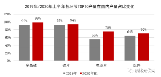 中國光伏行業協會表示,隨著光伏產業技術不斷發展,在快速更新迭代的同時,加速了行業的洗牌,相對過剩的落后產能加速出清,行業各環節集中度進一步提高。根據行業協會統計,2020年上半年,多晶硅、硅片、電池、組件四大環節TOP10企業產量在國內產量的占比分別為99%、94%、75%和70%,比2019年有所提升,其中電池片環節提升非常明顯,多晶硅環節訂單更是幾乎被TOP10企業全部囊括。