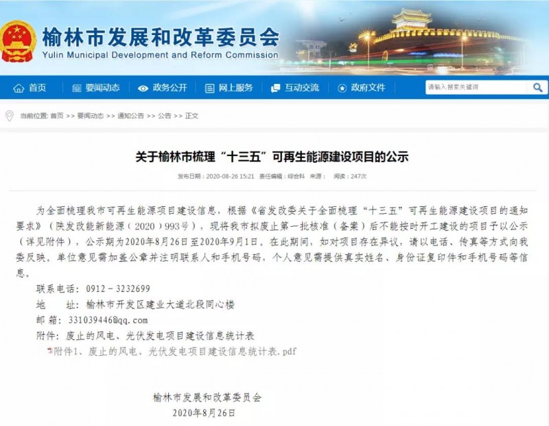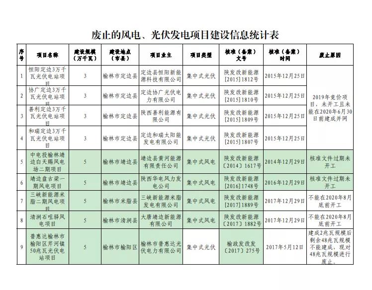 為全面梳理我市可再生能源項目建設信息,根據《省發改委關于全面梳理“十三五”可再生能源建設項目的通知要求》(陜發改能新能源﹝2020﹞993號),現將我市擬廢止第一批核準(備案)后不能按時開工建設的項目予以公示(詳見附件),公示期為2020年8月26日至2020年9月1日。在此期間,如對項目存在異議,請以電話、傳真等方式向我委反映。單位意見需加蓋公章并注明聯系人和手機號碼,個人意見需提供真實姓名、身份證復印件和手機號碼等信息。