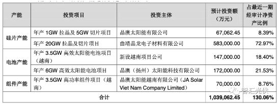 公司擬對公司一體化產能進行擴建,預計投資額103.91億元,分別對硅片、電池、組件等一體化產能進行擴建。