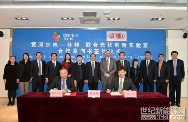杜邦與國家電投黃河公司簽署聯合光伏創新實驗室合作意向書,促進光伏行業前沿技術的升級發展,推進高效可靠的太陽能應用普及。黃河公司副總經理劉柏年、杜邦亞太區技術總監及中國研發中心總經理顧旭青博士(前排從左至右)、黃河公司總經理魏顯貴、杜邦電子與通訊事業部全球總裁JonKemp、黃河公司董事長謝小平、杜邦光伏與先進材料全球銷售總監汪偉(后排右五至右八)