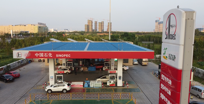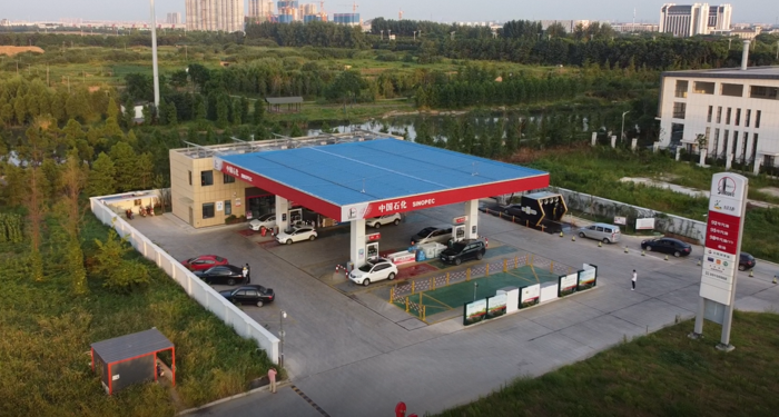 圖為,安裝了光伏發電設備和“驛公里”無人值守洗車的金壇新華東加油站,以科技力量實現安全環保、降本增效。