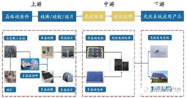 太陽能光伏產(chǎn)業(yè)鏈由三大環(huán)節(jié)組成,分別為:上游硅料和硅片,中游電池片和下游組件,以及最終端的光伏電站。
