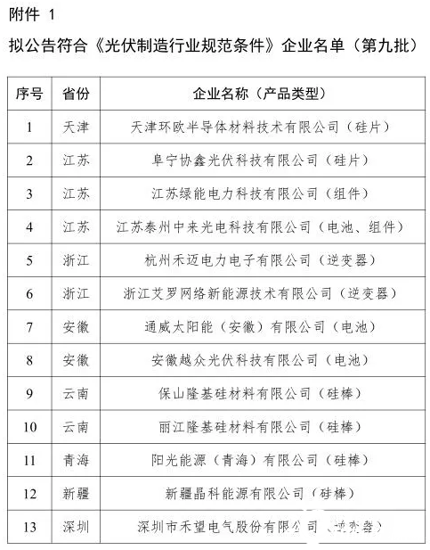1.擬公告符合《光伏制造行業(yè)規(guī)范條件》企業(yè)名單(第九批)
